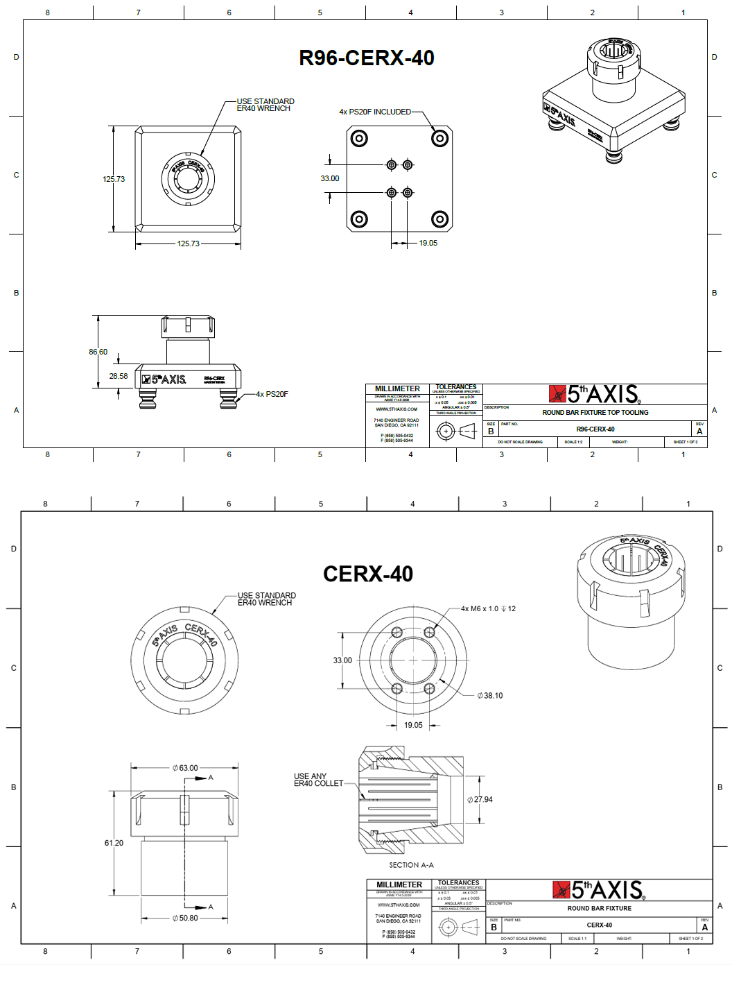 5th Axis RockLock 96mm 퀵 체인지 탑 툴링 시스템으로 가공의 미래에 투자하세요. 경쟁력을 유지하고 생산성을 높이며 가공 작업에서 뛰어난 결과를 달성하세요. 품질, 정밀성, 혁신에 대한 당사의 헌신을 신뢰하고 오늘 귀사의 가공 역량을 새로운 차원으로 끌어올리세요. R96-CERX-40은 수직 밀링에서 원형 공작물을 가공하는 데 이상적인 솔루션입니다. 이 고정 장치는 모든 표준 ER40 콜렛과 호환되므로 다양한 직경의 재고를 쉽게 클램핑할 수 있습니다. 본체는 엄격한 표준에 따라 경화 합금강으로 제조됩니다.